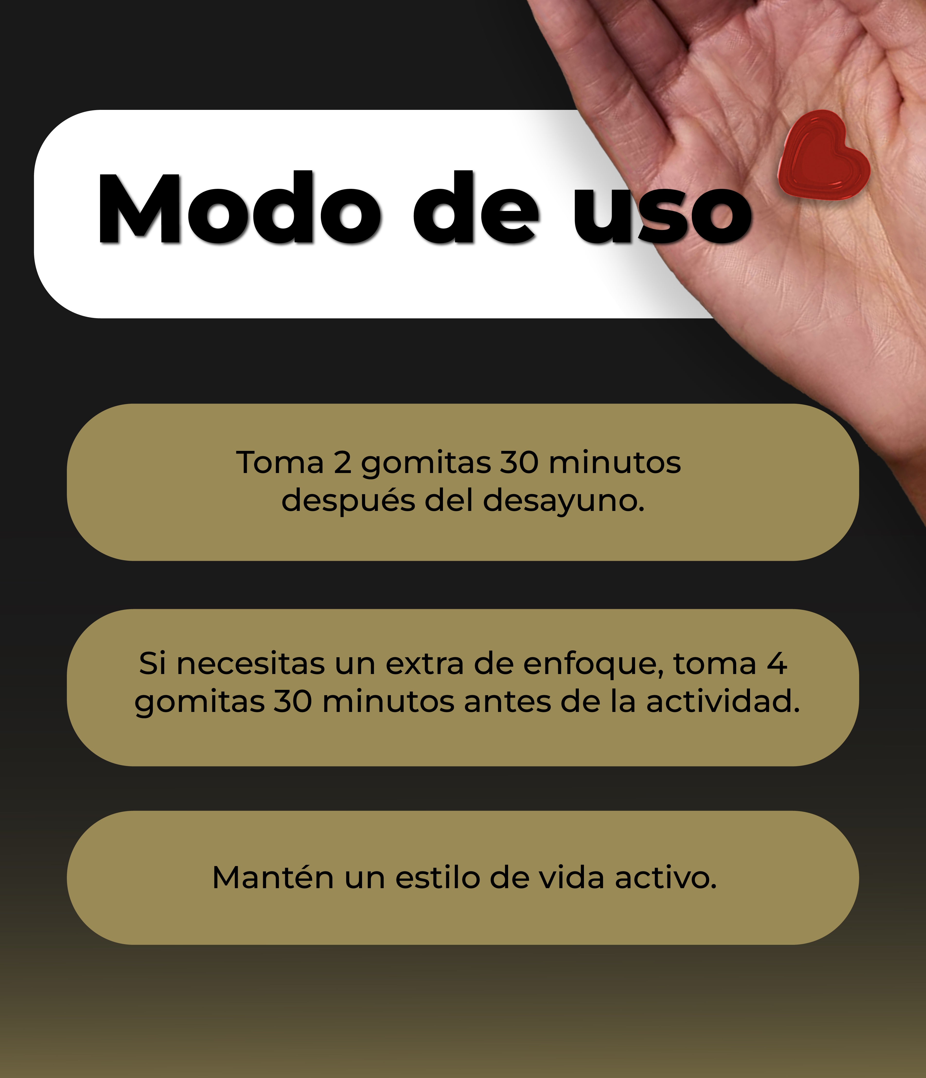 Toma las 2 gomitas diarias 30 minutos después del desayuno. Para un efecto potenciador, toma 4 gomitas adicionales 30 minutos antes de la actividad. En mujeres, ayuda a potenciar la libido, y en hombres, contribuye al aumento de la testosterona.